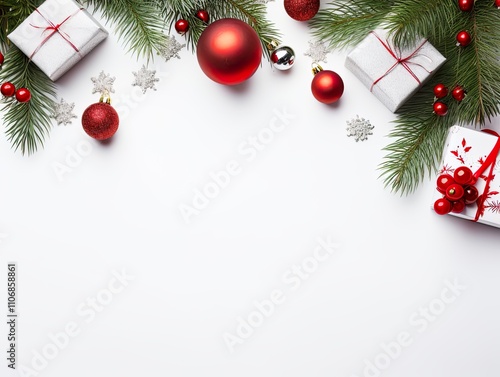 christmas, background, decoration, festive, holiday, christmas, winter, merry, card, decor, celebration, concept, ornament, design, layout, gift, tree, happy, modern, present, year, frame, new, white, table, banner, border, topview, season, fir, composition, red, new year, template, bauble, isolated, pattern, box, greeting, minimal, confetti, overhead, flier, vector, tree branch, creative