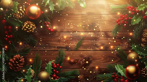 Christmas decorations with red berries, pine branches, golden ornaments, and warm festive lighting on rustic wooden background.