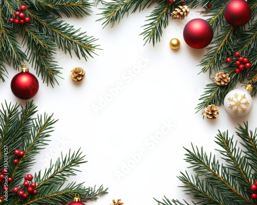 Christmas Element: Festive Holiday Decoration with Fir Tree Branches and Ornaments on White Background