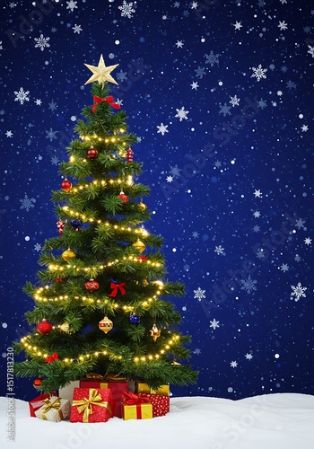 christmas tree, christmas, tree, light, ornament, gift, present, red, gold, snow, snowflake, blue, background, festive, holiday, decoration, illumination, evergreen, season, celebration, happy, joy, sparkle, night