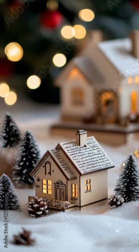 Christmas Festival Celebrations with Wooden House Models and Gift Boxes, Festive Decorations, Cozy Warm Home, Holiday Cheer and Joy in a Winter Wonderland, Perfect for Real Estate Seasonal Promotions