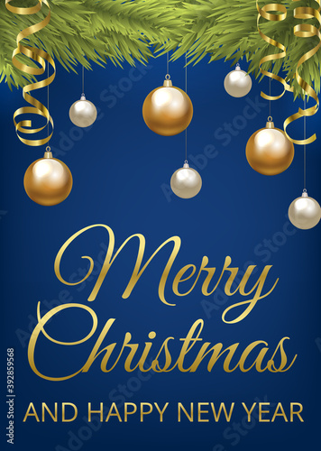 Christmas fir tree with baubles and golden serpentine. Christmas card