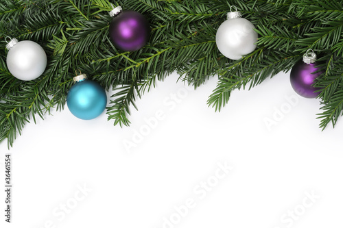 christmas, bauble, background, border, fir, tree branch, bright, december, decoration, frame, holiday, horizontal, isolated, ornament, purple, seasonal, twig, violet, white, christmas, winter, new year