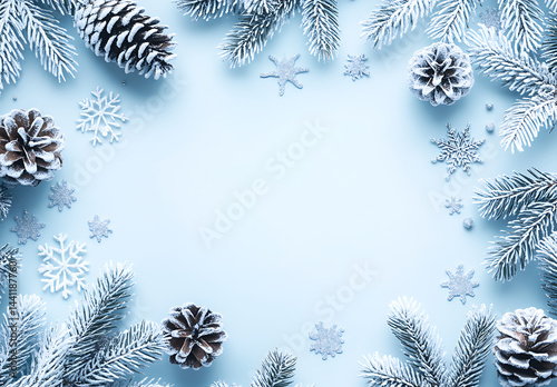Christmas frame background with winter elements, snowflakes and pine cones, pastel blue color palette, white space in the center for text or design