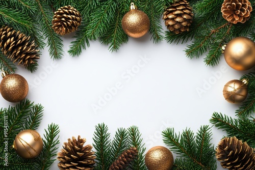 Christmas Frame with Gold Ornaments and Pinecones on Evergreen Branches
