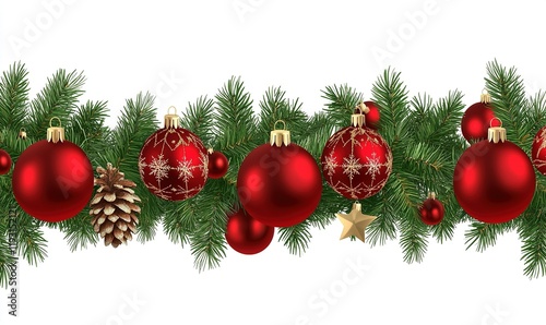Christmas garland with red ornaments, pine cones, and gold star on white background for holiday designs