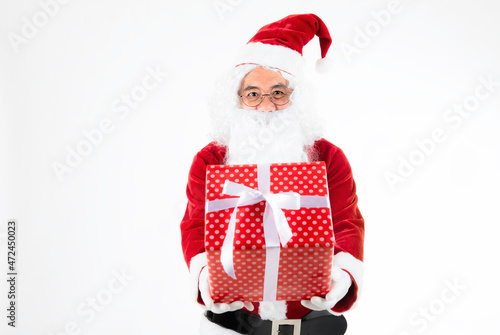 Christmas gift and happy New Year- Santa claus giving gift box. Santa claus with giftbox of presents on white background.