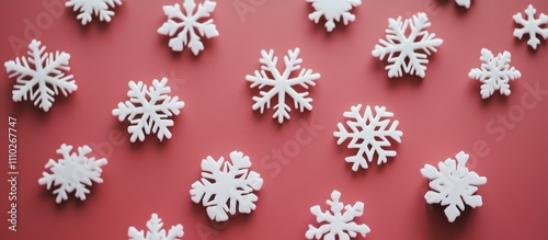 Christmas gift boxes adorned with white snowflakes on a vibrant red background from an overhead perspective for holiday themes