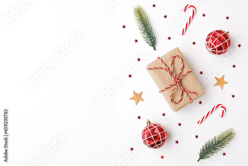 christmas, background, bow, ribbon, concept, white, new, year, winter, flat, lay, composition, space, copy, christmas, decoration, box, holiday, present, gift, merry, event, ornament, season, celebration, toy, festive, up high, table, decor, art, desk, bauble, ball