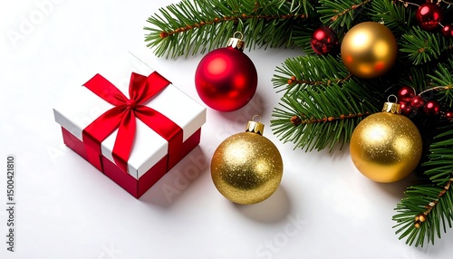 christmas, gift, present, ornament, bauble, fir, tree branch, red, gold, ribbon, holiday, winter, festive, decoration, celebration, christmas, season, new year, background, happy
