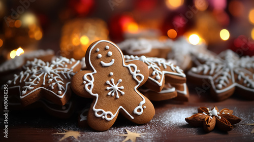 Christmas gingerbread man with white icing. Blurred background with bokeh.