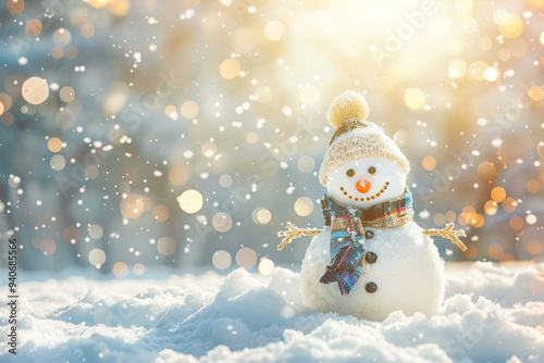 Christmas greeting card with bright winter holiday snowman and New Year background
