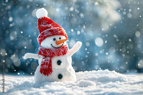 Christmas greeting card with bright winter holiday snowman and New Year background