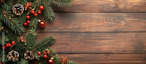 Christmas greeting card with fir branch decorations and fir tree on a wooden background providing ample copy space for customization
