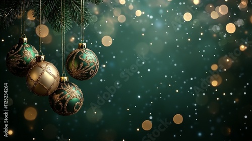 Christmas greeting card with hanging balls, dark green background