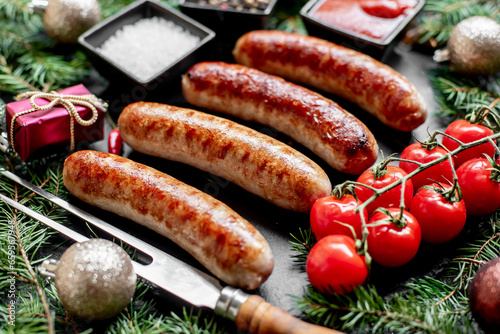 Christmas grilled sausages with spices on a stone background with Christmas trees and Christmas decorations, gifts