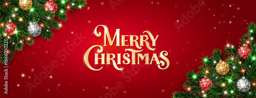 Christmas holiday background. Christmas tree frame with ornaments, Christmas lights. Gold and red glitter corner decoration. Merry Christmas lettering. For New year banners, party posters.