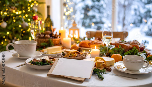 christmas, dinner, feast, holiday, celebration, table, food, table setting, white, candle, warm, cosy, winter, seasonal, delicious, epicure, traditional, family, gathering, home, christmas tree, light, wine, cheese, turkey, roast, dessert, plating
