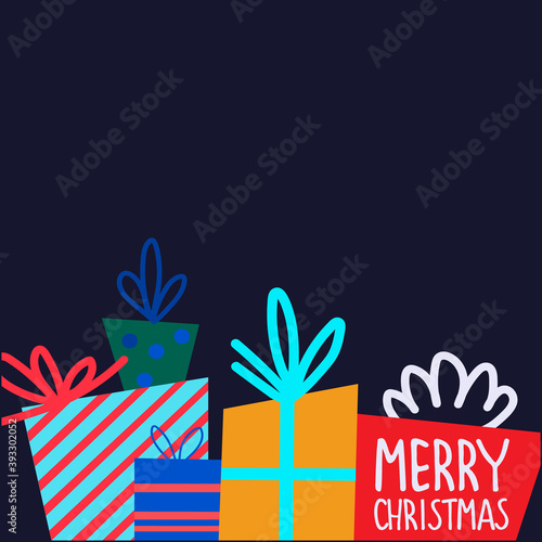 present, gift, christmas, merry, holiday, greeting, package, parcel, vector, object, group, card, template, christmas, birthday, background, cartoon, children, children, kind, decoration, trendy, cute, cosy, hand, drawn, colourful, many-coloured, flat, graphic, design, print, isolated, dark