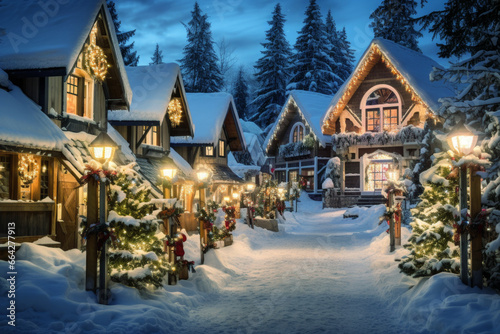 Christmas Holidays village with Snow illuminated with christmas lights.