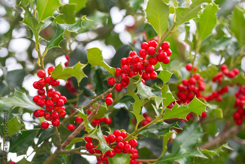 Christmas Holly red berries, Ilex aquifolium plant. Holly green foliage with mature red berries. Ilex aquifolium or Christmas holly. Green leaves and red berry Christmas holly, close up