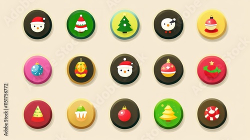 christmas, icon, holiday, winter, festive, celebration, design, graphic, illustration, digital, art, symbol, santa, snowman, tree, ornament, ball, gift, candy, sweet, christmas, december, new year, season, joy, merry, happy, colourful, cute, round, circle, buttons, flat, style, vector, image, element, collection, set