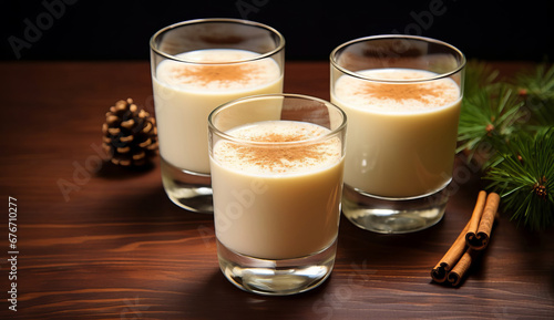 Christmas milk drink with spices, eggnog, in glass glasses, holiday mood.