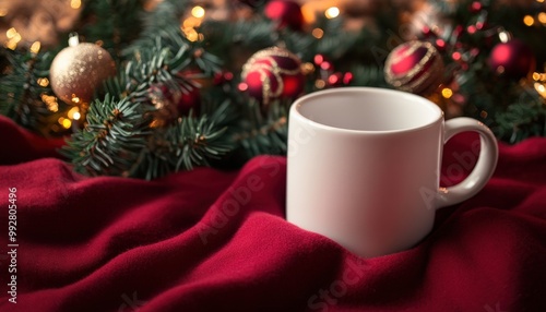 christmas, mug, white, pine, branch, ornament, red, gold, fabric, holiday, festive, decoration, cosy, warm, soft, inviting, background, design, blank, minimalist, tree, bauble, light, seasonal, celebration, scene, merry