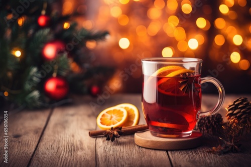 Christmas mulled red wine with spices and fruits on a wooden table against a background of Christmas lights. Traditional hot drink at Christmas