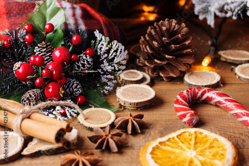 Christmas, New Year background greeting card banner. Christmas branch on a wooden background next to slices of orange, spicy spices and a frozen cane. Selective focus. Copy space