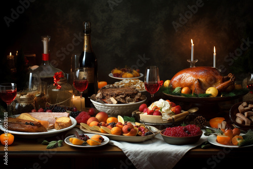 holiday, from above, no people, tradition, table, festive, eating, arrangement, meal, background, celebration, elegant, dining, family, seasonal, thanksgiving, christmas, food, christmas, setting, generative, ai