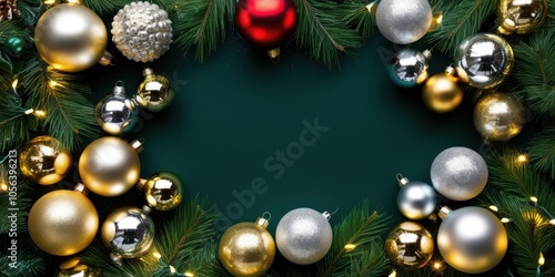 Christmas ornaments, gold and silver baubles, colorful spheres, pine branches, dark green background, festive border, holiday decoration, circular arrangement, shiny metallic surfaces, seasonal cheer,
