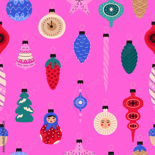 Christmas ornaments. Seamless pattern of New Year's toys for the Christmas tree. Vintage old toys. Vector illustration.