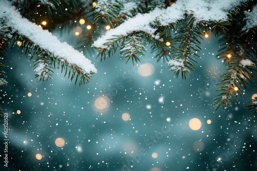 Christmas picture background with fir branches snow and fairy lights. stock photo Atmospheric image background with fir branches snow and fairy lights in different depths of field with generative ai