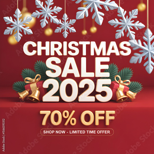 christmas, sale, 2025, 70, percent, off, discount, red, banner, poster, label, web, three-dimensional, render, gold, bell, snowflake, gift, box, christmas, holiday, winter, december, promotion, advertising, marketing, commercial, retail, business, festive, celebration, season, shopping, online, digital, image, graphic, design, ready, custom, size, social, media, vector, vintage, card, illustration, summer