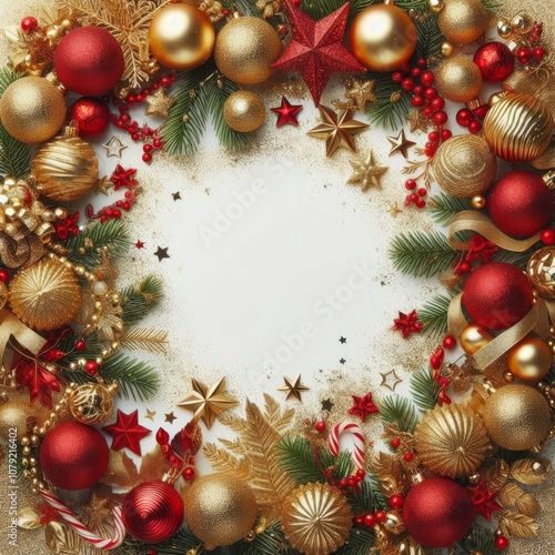 Christmas seamless decoration isolated on white background. Christmas tree border, frame. Gold and red glitter ornaments, stars. For holiday headers, banners, party posters