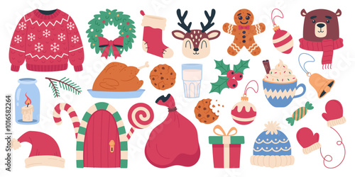santa, set, christmas wreath, stocking, reindeer, gingerbread, bear, candle, turkey, gift bag, present, hat, mitten, decoration, holiday spirit, snowflake, winter landscape, isolated, element, freestanding, hand-drawn, christmas, decoration, illustration, candy, star, winter, cake, new