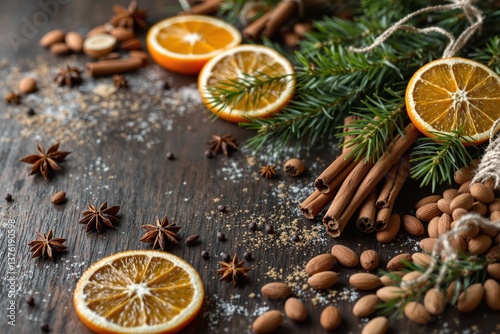 christmas, spice, orange, creative, background, slice, fir, branch, festive, cosy, holiday, cinnamon, almond, star, anise, decoration, seasoning, rustic, wooden, aromatic, winter, celebration, natural, nut, dried, citrous, pine, ingredient, warm, brown, sweet, traditional, organic, epicure, favor, wood, culinary, composition, dessert, sugar, kitchen, food, fresh, healthy, closeup, texture, ai, generative, illustration
