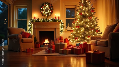 Christmas spirit and festive atmosphere - interior view of a cozy living room adorned with a holiday tree and wrapped presents.