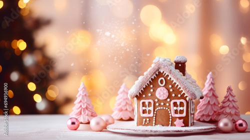 christmas table with gingerbread house and festive decorations, pink bokeh background with copy space