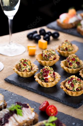 Christmas tapas with cheese balls and white wine, New year celebration, toasts for party dinner