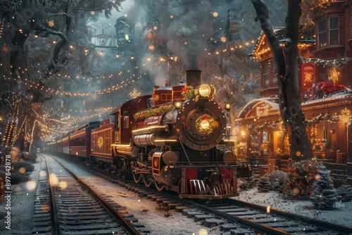 Christmas Train with Vintage Steam Engine and New Year's Garland and Gifts on the Front - Night Scene in Old Town, Hyper Realistic Oil Painting, High Resolution