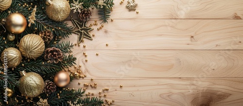 Christmas tree adorned with garland golden carved balls and other decorations on a light wood background with copy space image