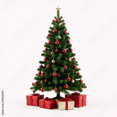 Christmas tree adorned with red ornaments and gifts against a white backdrop with ample space for text