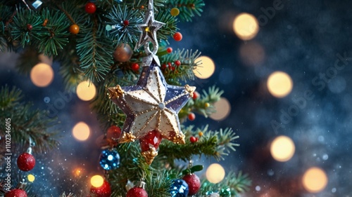 Christmas tree blue decorated with ornaments, star, pine cone