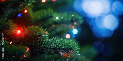 Christmas tree branch with bright glowing lights defocused blurred effect bokeh. Christmas fir and pine tree branches