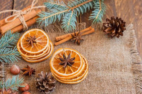 Christmas tree branch with dried oranges, cinnamon, nuts and anise star on wooden table