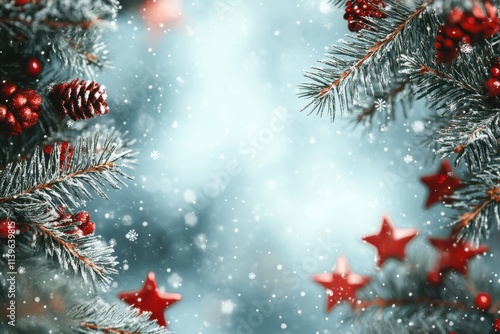 Christmas Tree Branches with Red Stars and Copy Space