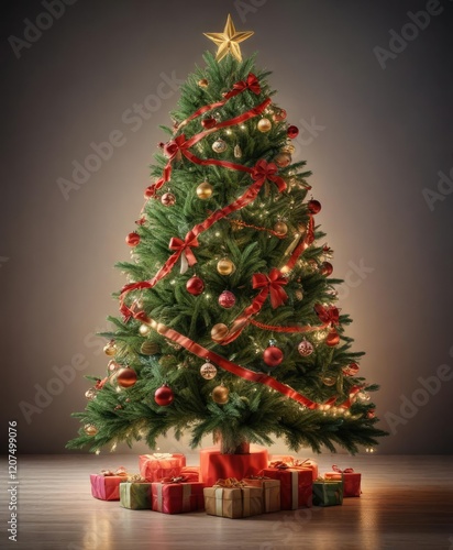 Christmas tree decorated with garlands and ribbons, spruce, festive, greenery