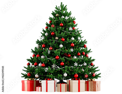 Christmas tree decorated with red and gold ornaments, balls and stars, surrounded by gift boxes and wrapped presents isolated on white background